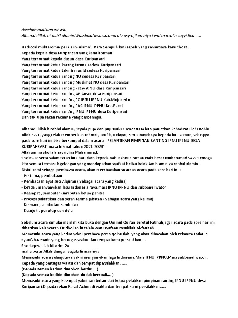 Pelantikan kepengurusan muslimat nu dan fatayat nu kutai barat. Teks mc fatayat nu dki jakarta. Teks pembawa acara (mc) pelantikan & pengajian umum. Pelantikan pimpinan anak ranting muslimat n u. Yang terhormat ketua ranting nu sedesa kuripansari yang terhormat ketua ranting muslimat nu desa kuripansari yang terhormat ketua ranting fatayat nu desa .